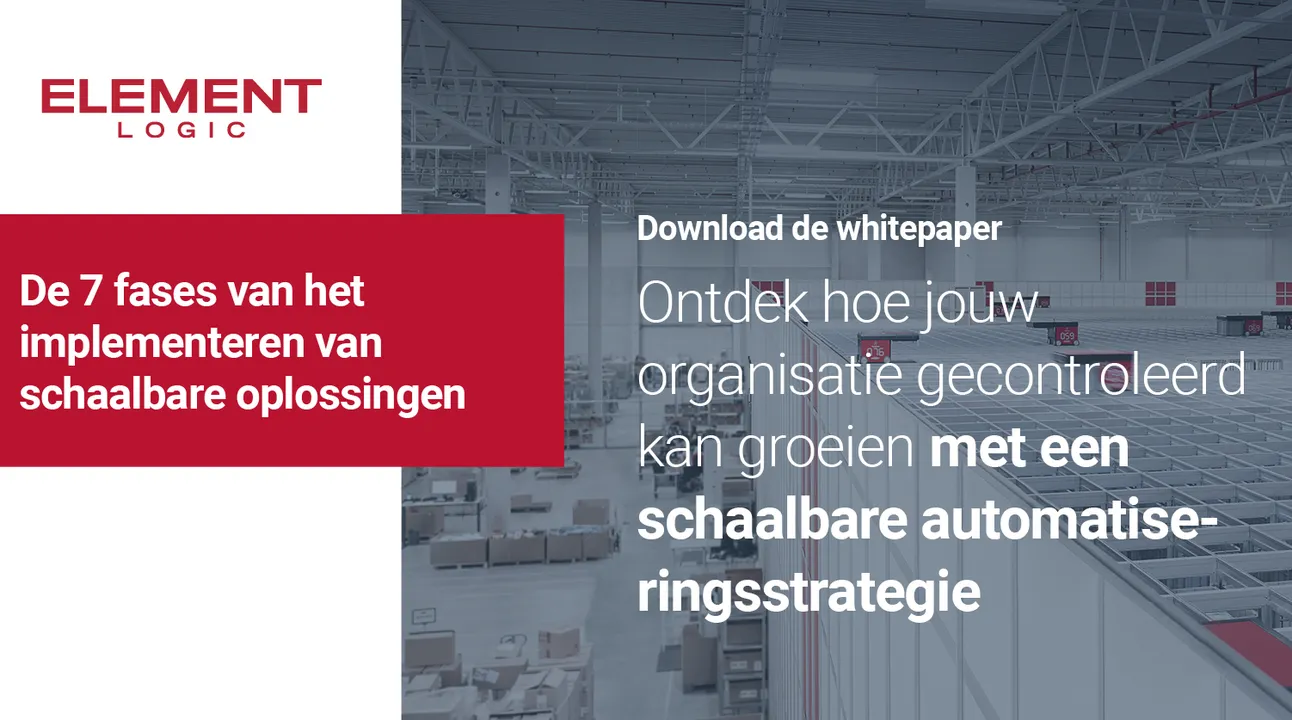 (Whitepaper) MKB-bedrijven die zonder chaos willen opschalen, hebben baat bij een gefaseerde aanpak. In de nieuwe whitepaper van Element Logic ontdek je hoe je magazijnautomatisering slim implementeert: van een sterke basis en schaalbare systemen tot soepele installatie en continue verbetering.