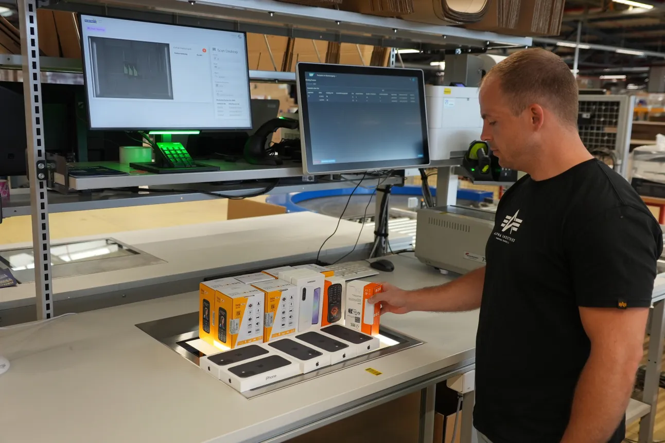 Na het pickproces worden de artikelen naar een van de veertien inpaktafels gebracht. Daar wordt elk product gescand om de synchronisatie met de ordergegevens te garanderen, waarna de artikelen worden verpakt en gelabeld voor verzending. Het scannen van smartphones vormt een specifieke uitdaging: modelnaam, serienummer en IMEI-nummer moeten nauwkeurig worden uitgelezen van erg kleine labels die soms niet groter zijn dan 25mm. Voor dual-SIM-smartphones is het proces extra complex aangezien deze twee IMEI-nummers bevatten waarvan er slechts één moet worden gescand.