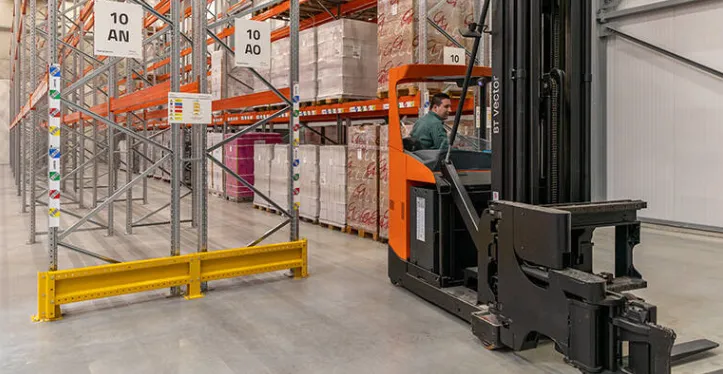 Om bij te blijven met deze groei, investeerden we in een nieuw magazijn in combinatie met een BT Vector VRE150 inductie gestuurde smallegangentruck. De palletstellingen zijn voorzien van unieke magneetlabels, afgestemd op het magazijnbeheersysteem.