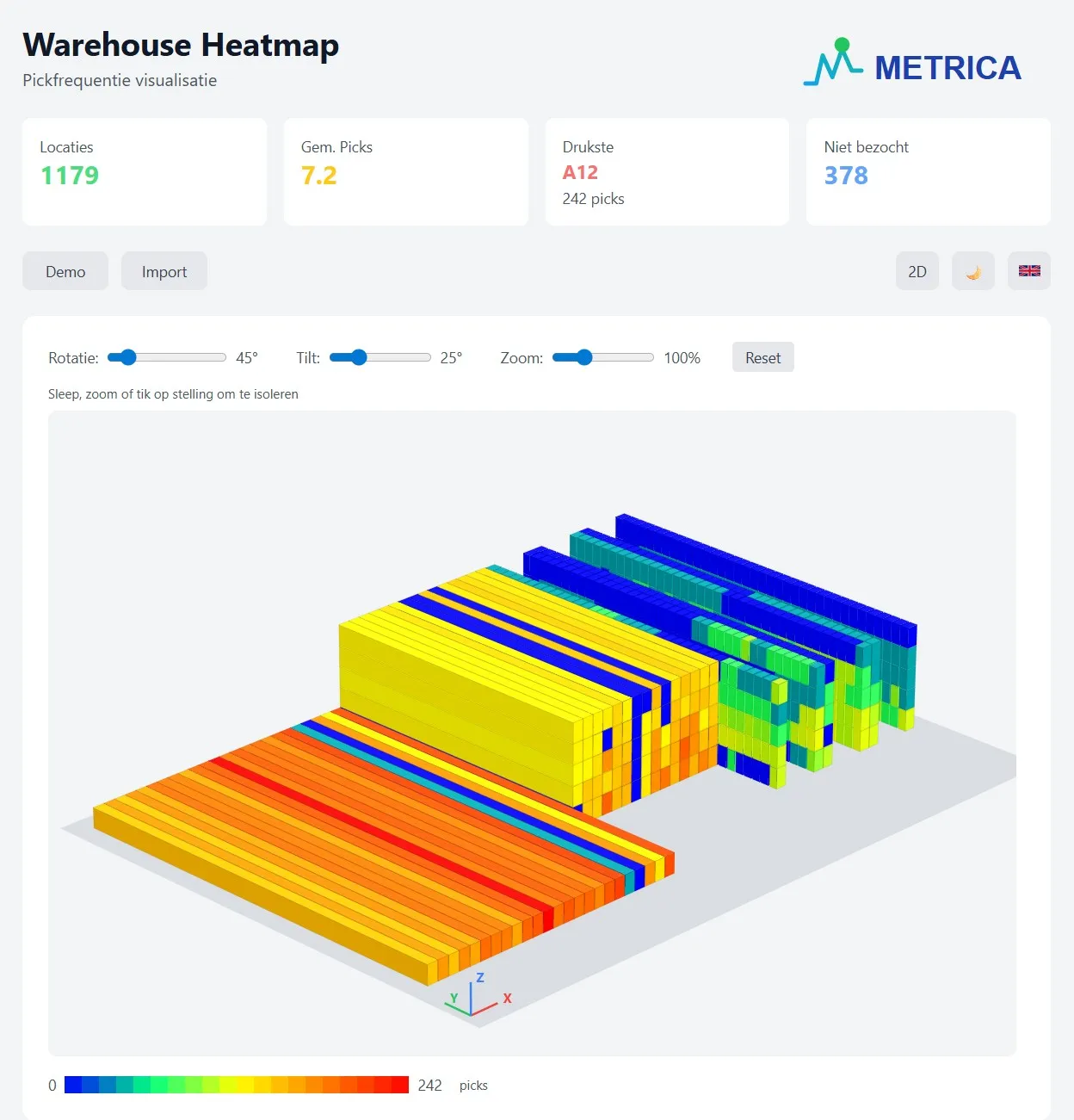 Jeroen van den Berg Consulting heeft een online warehouse heatmap ontwikkeld die de pickactiviteit in magazijnen inzichtelijk moet maken in zowel 2D als 3D.
