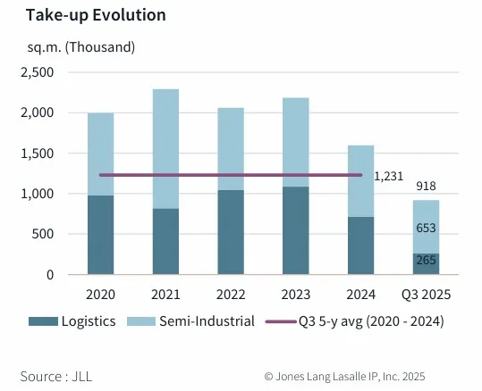 Meer dan de helft van het opgenomen volume werd gegenereerd door logistiek dienstverleners, gevolgd door fabrikanten (25%) en detailhandelaren en e-commercebedrijven (19%). De gemiddelde transactiegrootte voor het derde kwartaal van 2025 bedraagt 9.805m² voor logistiek en 1.246m² voor semi-industrieel.