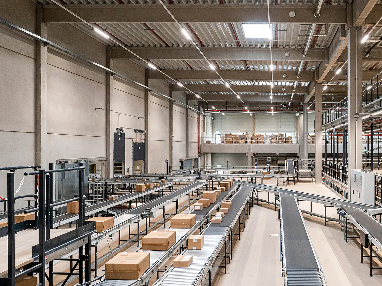 De webshopvoorraad is afzonderlijk opgeslagen en wordt via conveyors aangevuld vanuit inbound of het magazijn. Artikelen voor winkels worden eveneens automatisch via conveyors naar de juiste chute geleid.