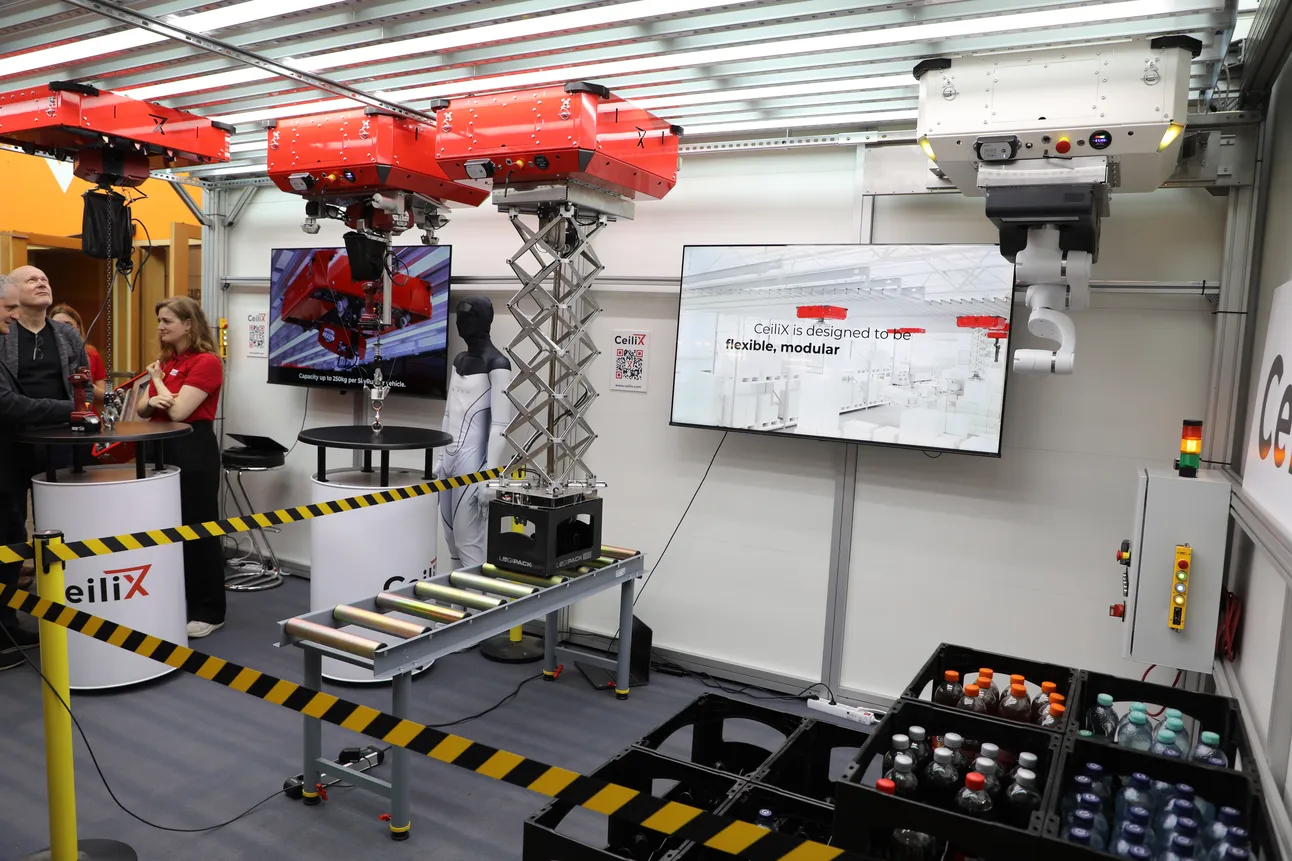 Dat autonome mobiele robots niet alleen over de vloer hoeven te rijden, toonde CeiliX. Het Duitse bedrijf ontwikkelt robots die zich voortbewegen over het plafond. In eerste instantie zijn deze SkyBots bedoeld als manuele tilhulp in productieomgevingen, maar ze kunnen zich ook autonoom in elke richting verplaatsen terwijl ze producten oppakken en transporteren. Daardoor blijft de vloer leeg, wat een uitkomst kan zijn in krappe omgevingen die ongeschikt zijn voor andere automatiseringsoplossingen.