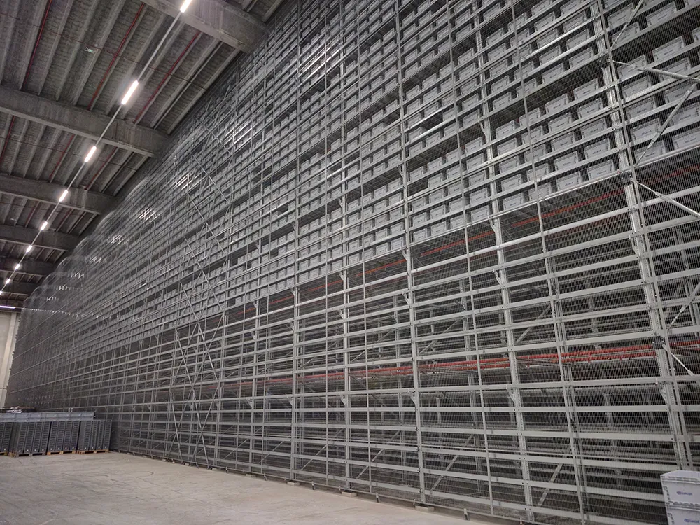 Bij ontvangst komen de goederen in bakken van 60 op 40 centimeter terecht, voorzien van QR-codes. De operatoren bepalen flexibel of ze een bak volledig, half of in kwartsegmenten benutten. Dat verhoogt de densiteit en beperkt pickfouten. Lege bakken keren automatisch terug in de cyclus.